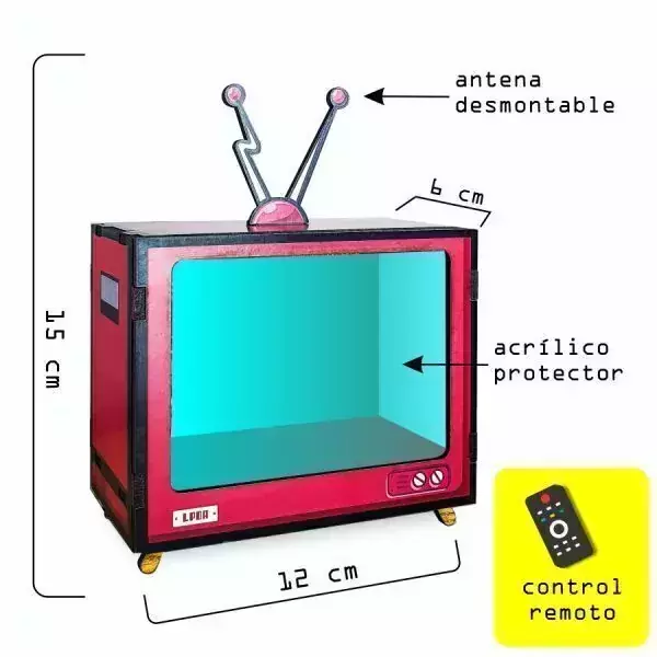 Este televisor está fabricado en madera MDF y cuenta con una pantalla de acrílico PET. La figura protagonista se encuentra despegada del fondo y montada a unos centímetros, creando un increíble efecto tridimensional.